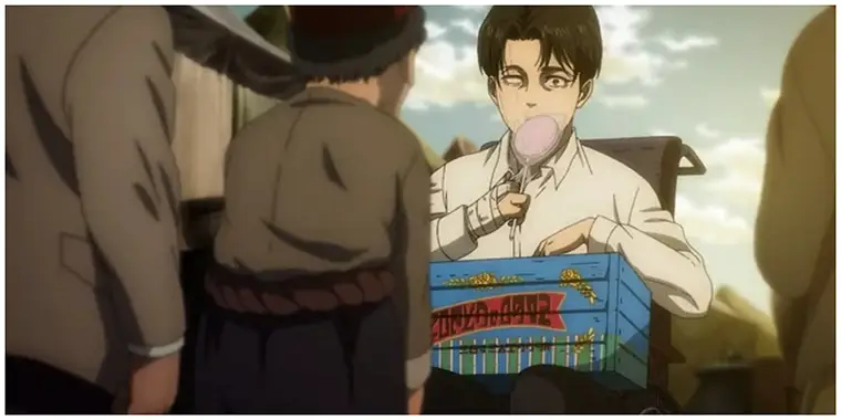 در مانگا: لیوای روی ویلچر در یک شهر مدرن دیده میشود (بدون زمینه خاص).