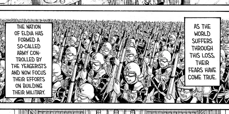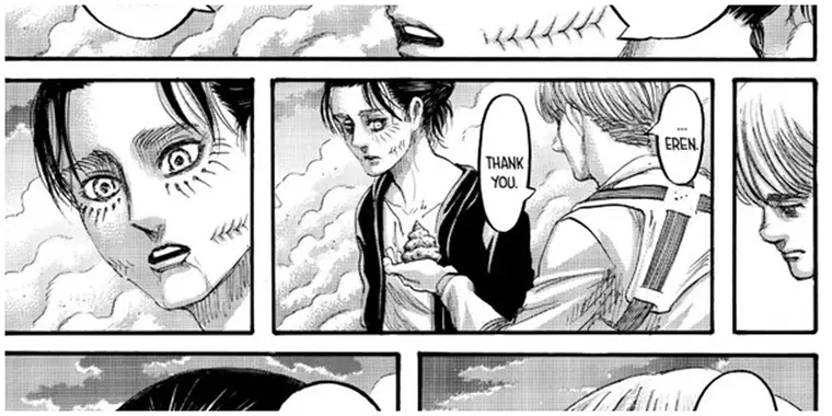 در مانگا: واکنش آرمین ملایمتر بود و حتی جملهای گفت که به نظر میرسید از ارن تشکر میکند (که بسیار جنجالبرانگیز شد).